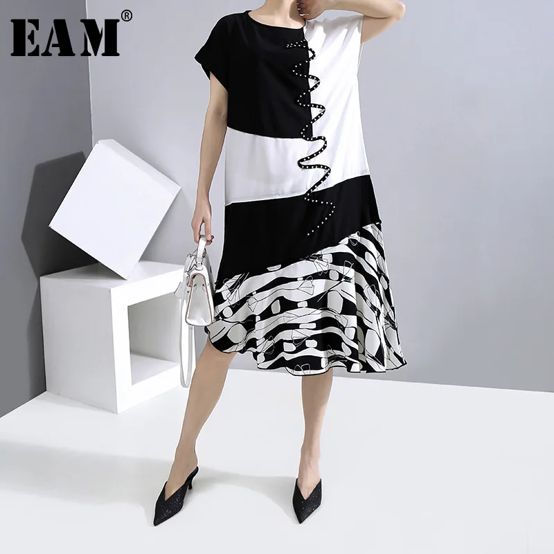 Женское платье с коротким рукавом EAM, черное платье с принтом и оборками, круглый ворот, свободный крой, весна-лето 2020 1W012