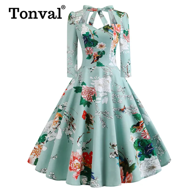 Tonval рокабилли цветочный принт элегантное миди милое платье Осень Женщины 3/4 длина рукава с открытой спиной галстук винтажные платья