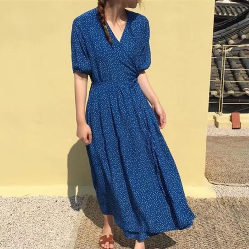 2018 синий горошек глубокий V образным вырезом короткий рукав высокая талия для женщин Тонкий платье