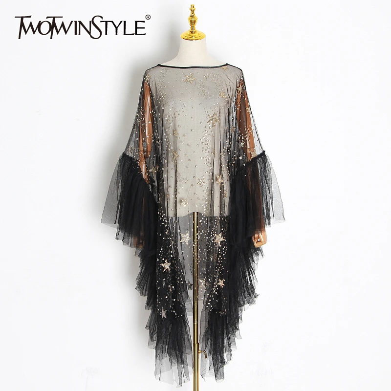 TWOTWINSTYLE лоскутное расшитое блестками популярное цветное платье для женщин с О-образным вырезом и длинным рукавом, сетчатые популярные цветные платья, летняя мода, новинка 2020