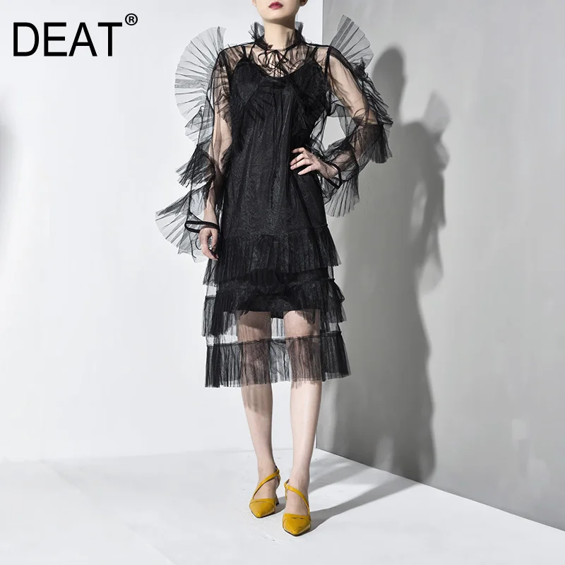 DEAT 2019 Новое весенне-осеннее кружевное объемное платье с длинным рукавом и воротником-стойкой из органзы, модное женское платье JZ045