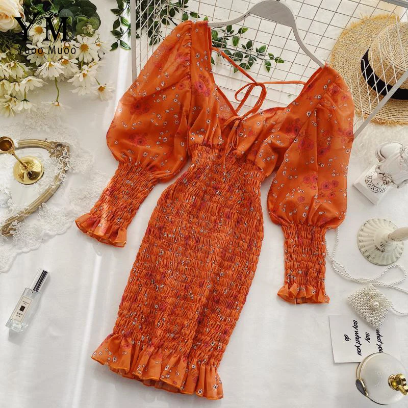 Женское винтажное облегающее платье YuooMuoo, оранжевое мини-платье с открытой спиной и цветочным принтом, весна-лето 2020