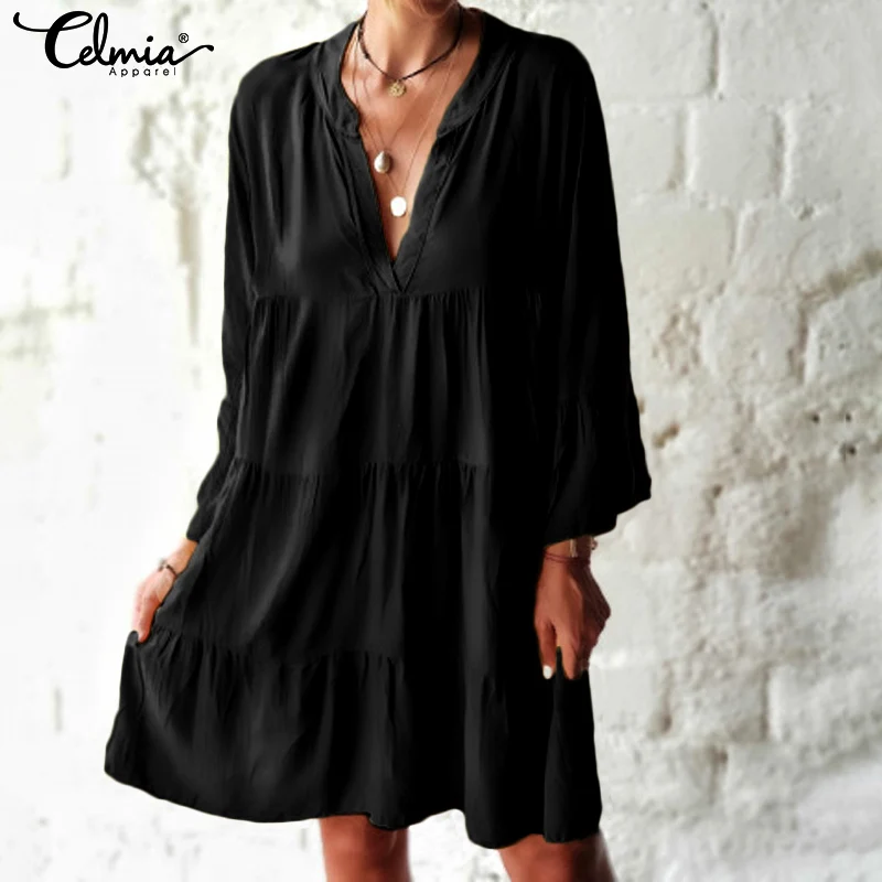 Женское Плиссированное мини-платье 2019, модные длинные рубашки, женские повседневные Свободные плиссированные короткие платья с v-образным ...
