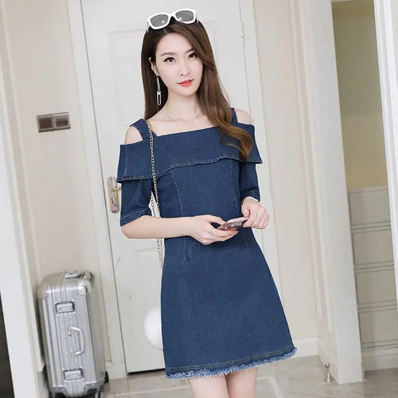 MISSKY 2019 Новое Женское джинсовое платье сплошной цвет Лето Джинсовая с открытыми плечами А-силуэт мини платье женская одежда