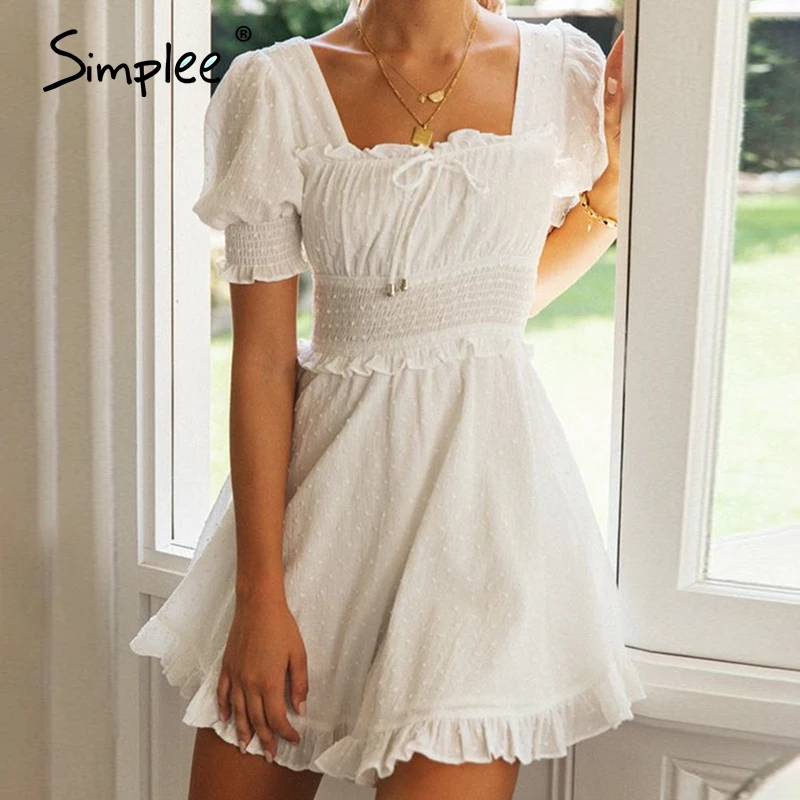 Simplee белые пикантные туфли с низким вырезом на спине вечерние короткое платье для женщин с высокой талией в горошек, с оборками мини-платье летнее праздничное пляжное платье Vestidos