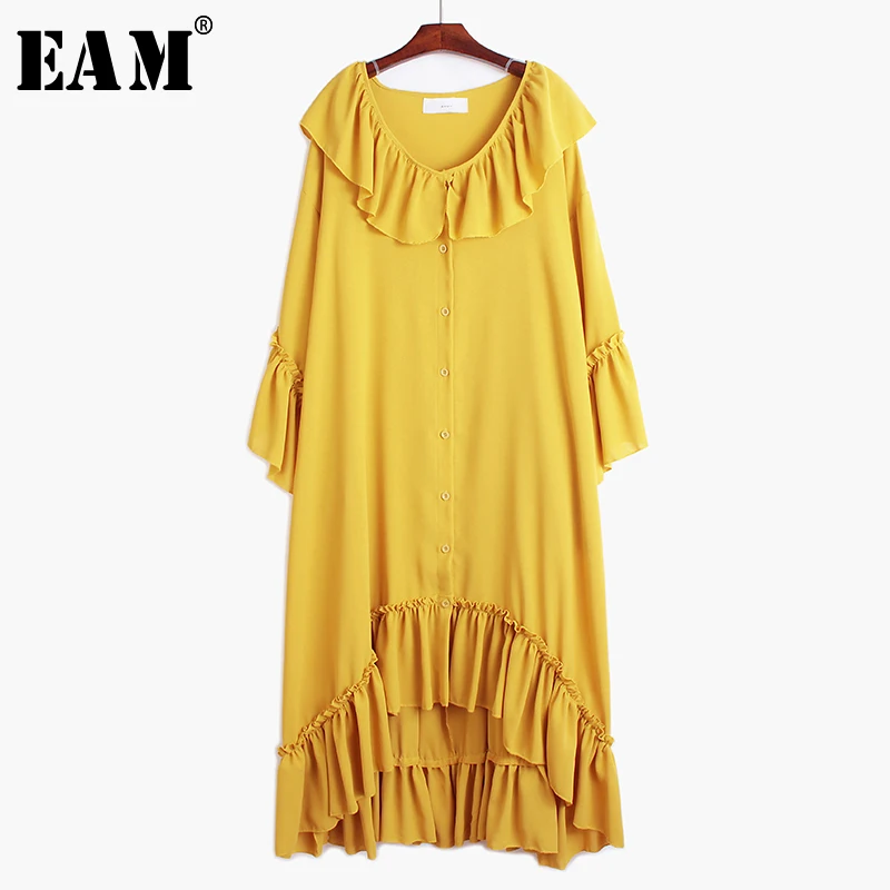 [EAM] женское Ассиметричное платье большого размера с разрезом и рюшами, новинка, v-образный вырез, длинный рукав, свободный крой, мода весна-осень 2020, 1S522