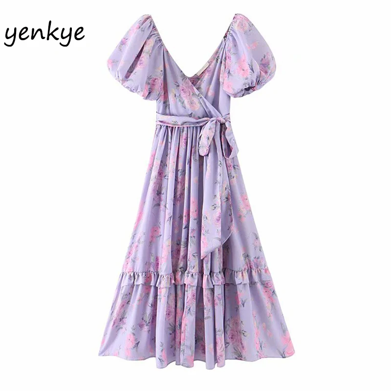 2020 женское милое длинное платье макси с цветочным принтом, женское элегантное вечернее платье трапециевидной формы с v-образным вырезом и п...