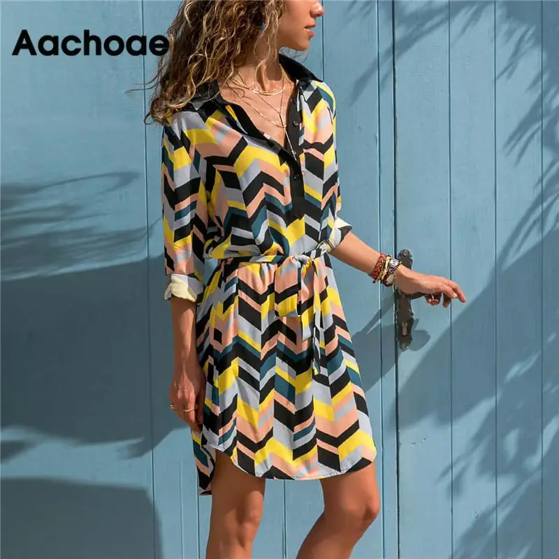 2019 Летние шифоновые пляжные платья, женские повседневные платья в стиле бохо с принтом, а-силуэт, мини-вечерние платья с длинным рукавом, Офи...