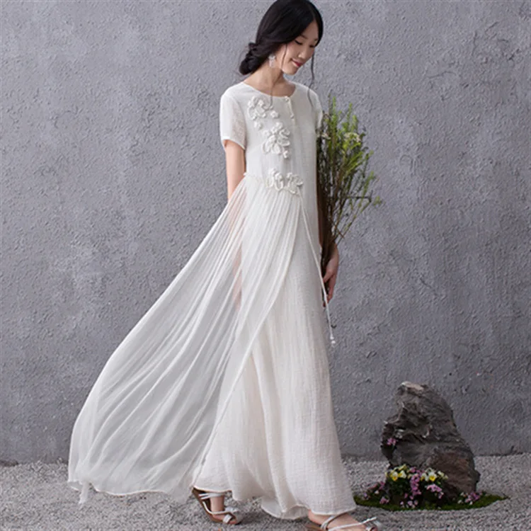 2018 однотонная цветная Цветочная вышивка пояса Хлопок Лен короткий рукав большой размер в пол литературное Ретро женское платье RE2120