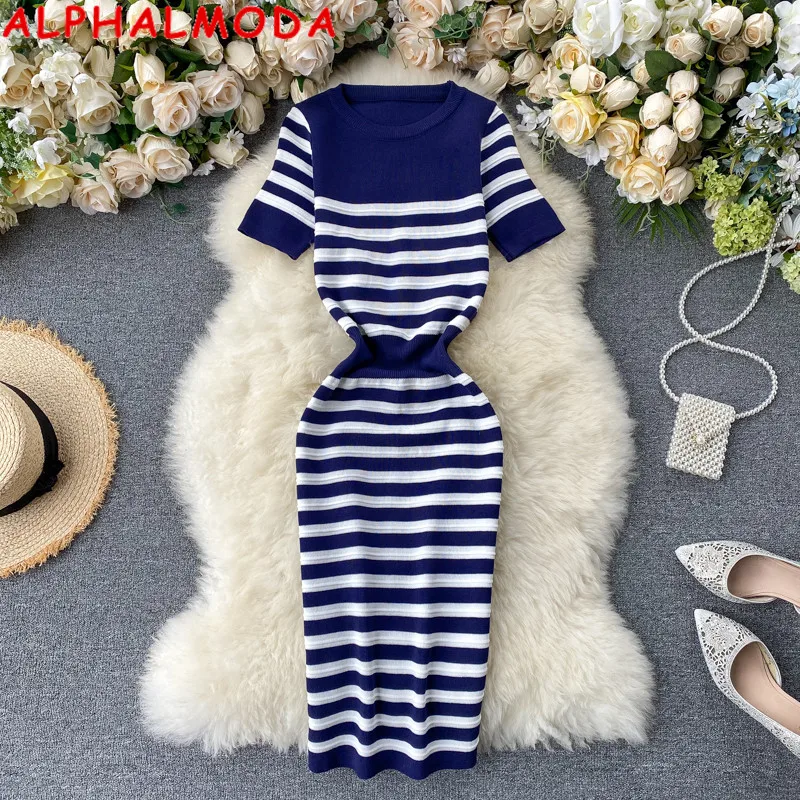 Женское Повседневное трикотажное платье ALPHALMODA, летнее винтажное платье в полоску с короткими рукавами