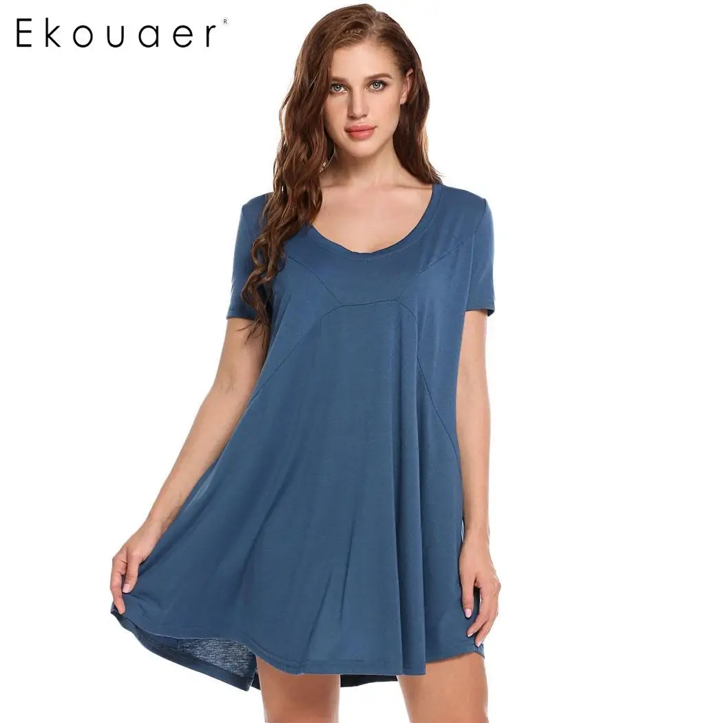 Ekouaer, летние платья для женщин, повседневные, короткий рукав, однотонный пуловер с круглым вырезом, прямое короткое платье размера плюс S-4XL, размер s