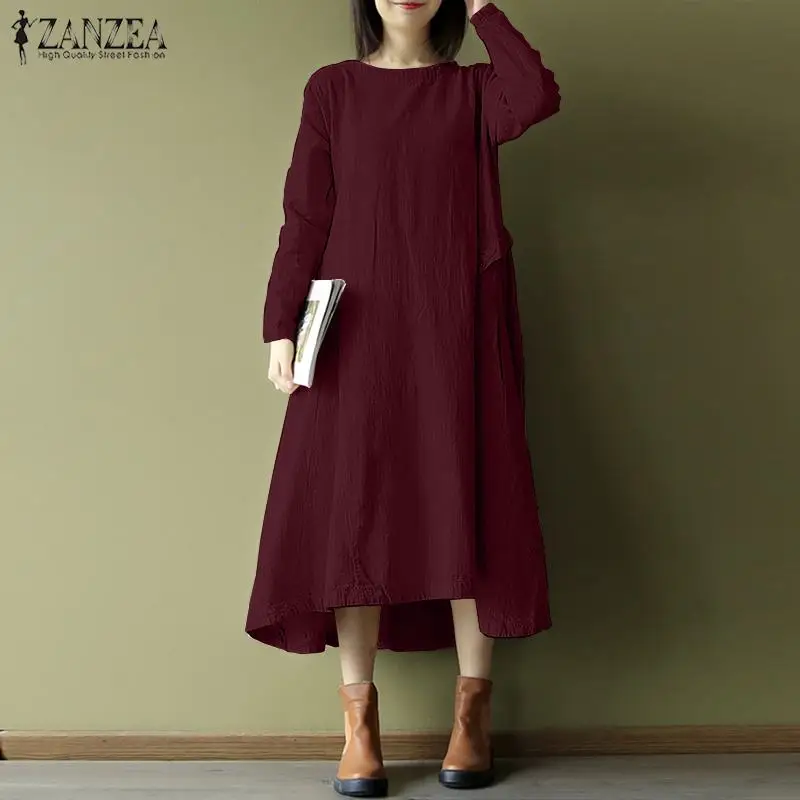 Женское платье-рубашка ZANZEA, винтажное однотонное Хлопковое платье с длинным рукавом для вечеринки, весна 2020, большие размеры
