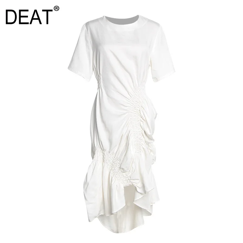 DEAT, новинка 2020, летнее асимметричное плиссированное платье-пуловер с круглым вырезом и короткими рукавами, с высокой талией, женское платье, WL696