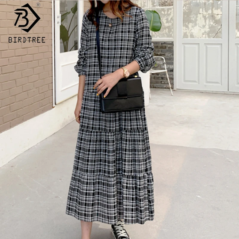 Плюс размер, осень 2019, новое женское платье-рубашка в шотландскую клетку, модное свободное платье миди с длинным рукавом и круглым вырезом, м...