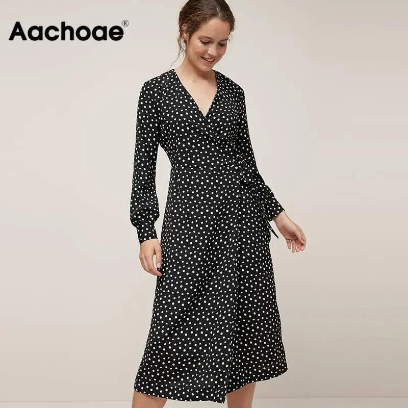 Женское винтажное повседневное длинное платье в горошек 2020, элегантное вечернее платье с v-образным вырезом и длинным рукавом, женское плат...