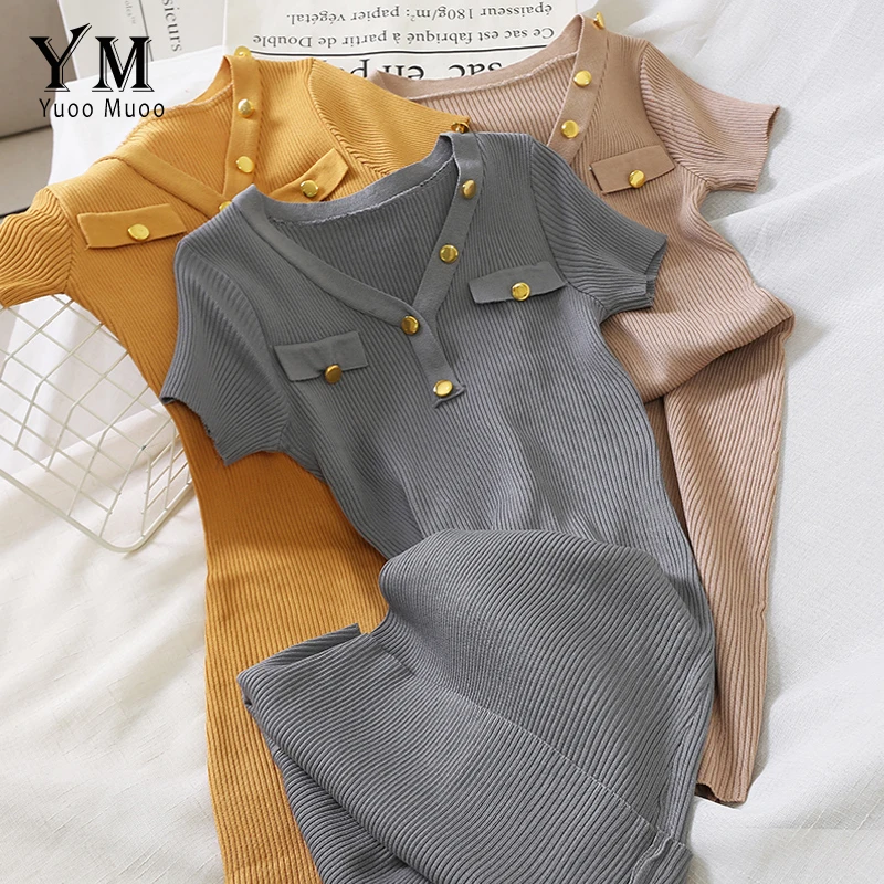 YuooMuoo Элегантное трикотажное облегающее платье с v-образным вырезом на пуговицах 2019 летнее женское базовое корейское черное миди-платье шик...