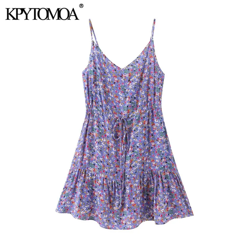 KPYTOMOA женское модное Плиссированное мини-платье с цветочным принтом, винтажное платье с открытой спиной и завязками на завязках, женские платья, 2020