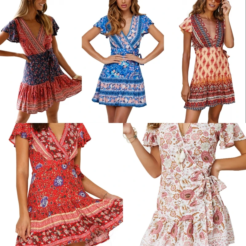 Летнее богемное женское платье с цветочным принтом, Пляжное платье миди, Сексуальные вечерние платья с коротким рукавом для отпуска