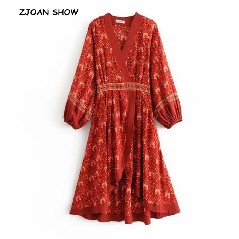 Богемное платье с v-образным вырезом, геометрический цветочный принт, красное этническое пляжное платье с рукавами-фонариками, асимметричн...