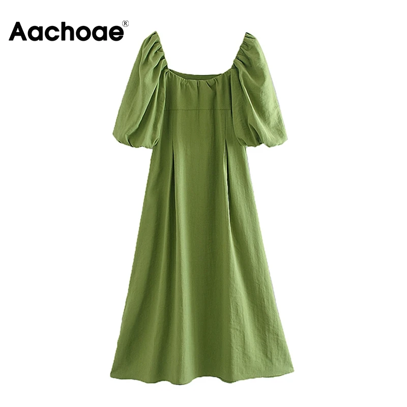 Женское зеленое плиссированное платье с пышными короткими рукавами, модные женские платья с квадратным воротником, свободное платье до колена, сарафан, Ropa Mujer