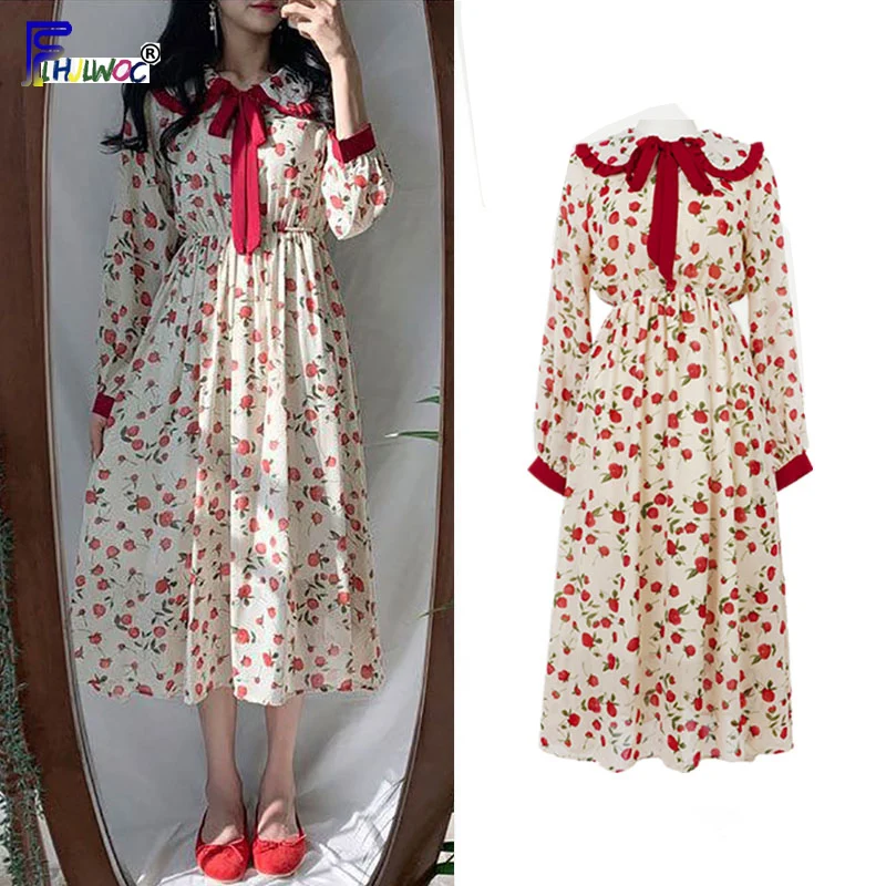 Галстук бабочка платья для женщин для перспективный длинный рукав Японии стиль Дизайн Винтаж с цветочным принтом трапециевидной формы мил...