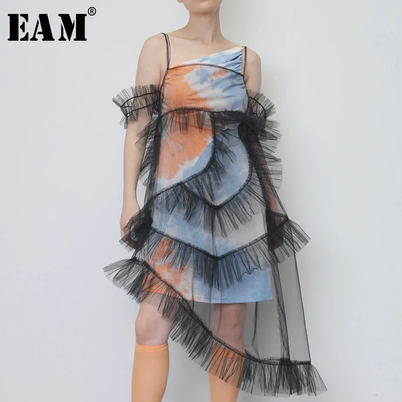 [EAM] 2019 Новое весенне-летнее платье без рукавов с сетчатыми оборками на бретельках, свободное, Радужное, необычное, модное женское платье JY080