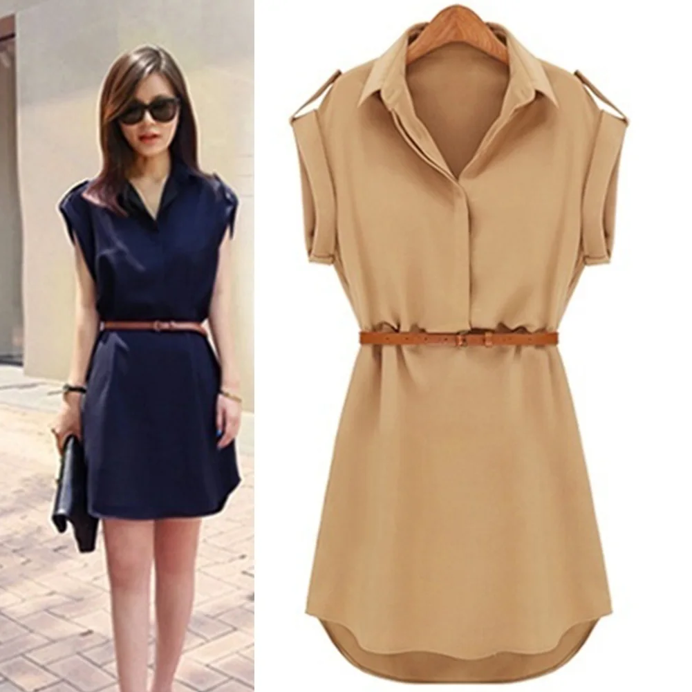Модное шифоновое платье, женское летнее свободное Повседневное платье-рубашка с коротким рукавом и воротником с отворотом с поясом, однотонное мини-платье