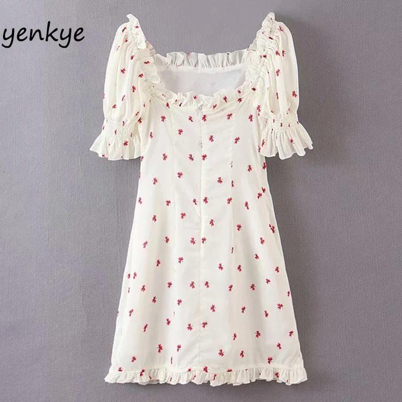 Милое платье с цветочным принтом, женское платье с квадратным вырезом и коротким рукавом, женское мини-платье трапециевидной формы, летнее шифоновое платье YF7448