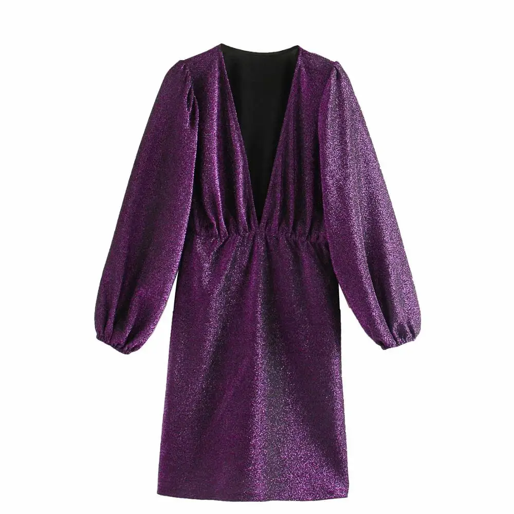 Новинка 2020, женское сексуальное блестящее трикотажное мини-платье с глубоким v-образным вырезом, женские шикарные платья с рукавом-фонарико...