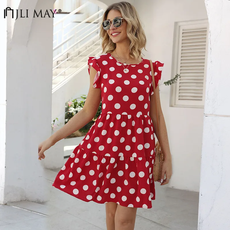 JLI может Ploka точка женские платья лето сладкий o-образным вырезом рукав бабочка сплайсинга оборками подол тонкий отдых Мини Сарафан