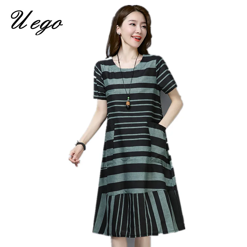 Uego 2019 Новое поступление модное Полосатое летнее платье хлопок лен карманы Плюс Размер Свободное женское Повседневное платье леди винтажное платье