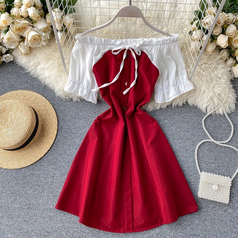 Женское милое платье с открытыми плечами, коротким рукавом, высокой талией, тонкое праздничное платье, Дамское сексуальное платье L094
