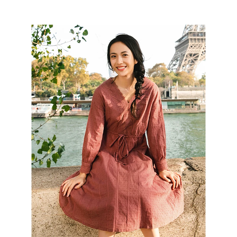 Инман 2019 Весна новое поступление женские v-образный вырез кружева литературный джентльмен подчеркивающий талию Тонкий ретро однотонный А-С...