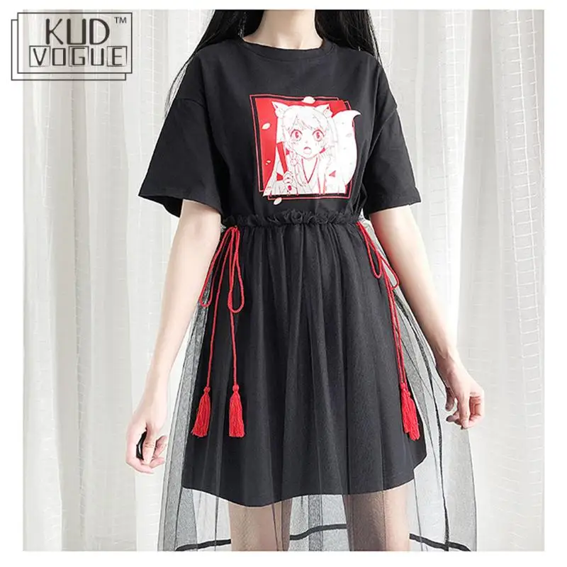 Винтажный комплект из двух предметов в стиле Лолиты; платье с фатиновой юбкой + футболки; Harajuku Kawaii; длинное черное платье с героями мультфильмов; женское сетчатый в готическом стиле платье для девочек-подростков