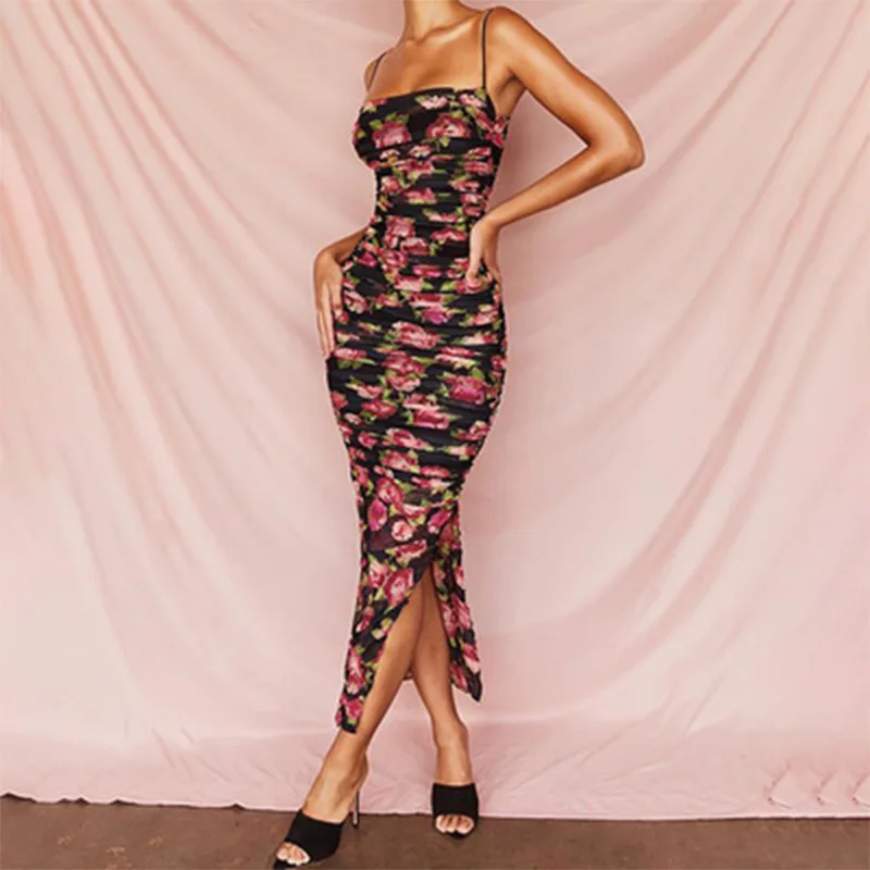 Летние сетчатые вечерние платья до середины икры с цветочным принтом