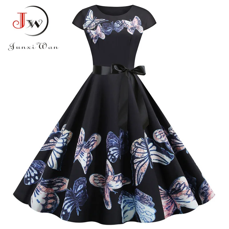 Винтажное летнее женское платье 2020, модное черное платье с круглым вырезом и цветочным принтом, с коротким рукавом, элегантные вечерние платья а-силуэта в стиле рокабилли