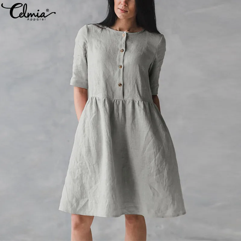 Хлопковое льняное платье-рубашка, женское летнее винтажное платье с коротким рукавом и пуговицами, Повседневные Вечерние Платья До Колена размера плюс