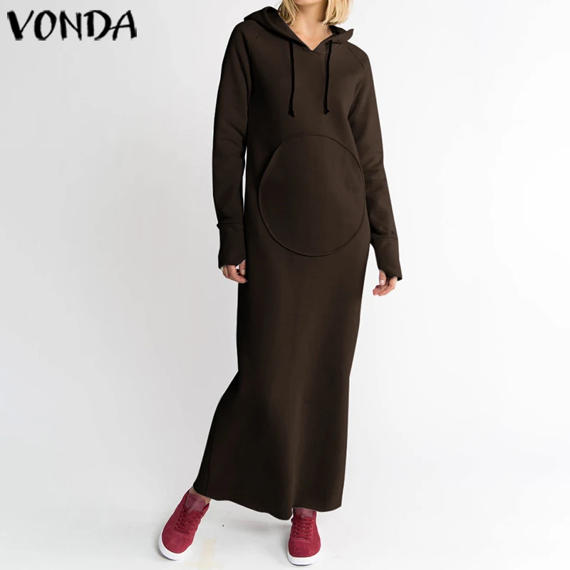 Осеннее Однотонное Платье макси с длинным рукавом VONDA, женские повседневные свободные толстовки, толстовка с капюшоном, Платья для вечерино...