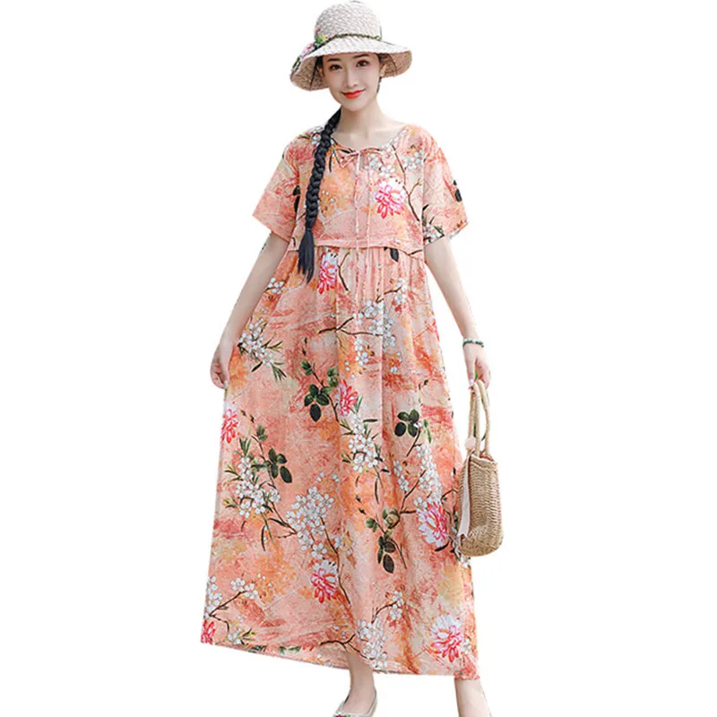 Женское летнее платье размера плюс 4XL 5XL, с цветочным принтом, бохо, хлопок, лен, длинные платья, свободное, большое, женское, Пляжное Платье, ...