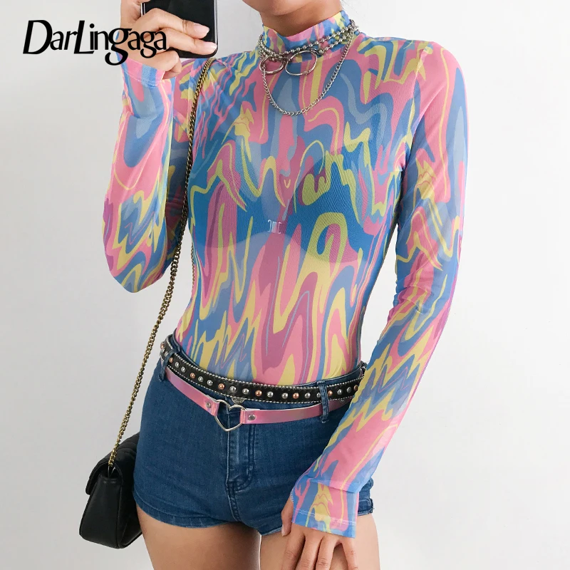 Darlingaga Половина Водолазка красочные сетки боди прозрачное тело женщин печати сексуальный комбинезон мода летнее боди Топ