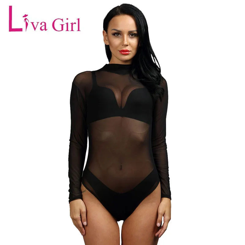 ЛИВА девушка черные сетчатые прозрачный комбинезон 2019 Для женщин сексуальный комбинезон комбинезоны с длинным рукавом Топы комбинезон дам...