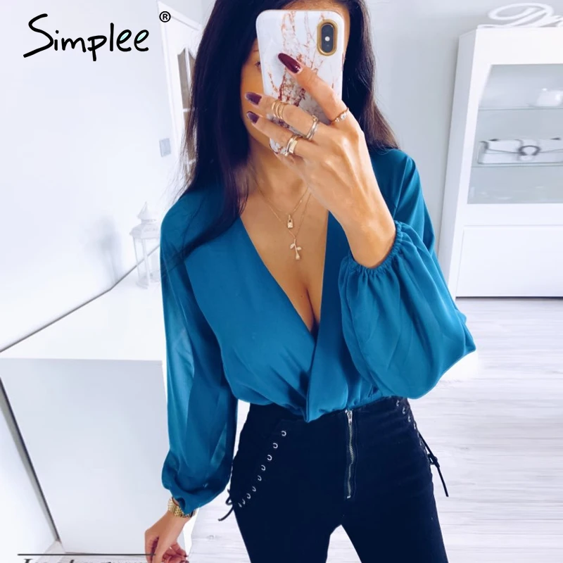 Simplee сексуальные синие сетчатые повседневные боди с v-образным вырезом Элегантные Вечерние боди с длинным рукавом шикарный комбинезон для работы в офисе