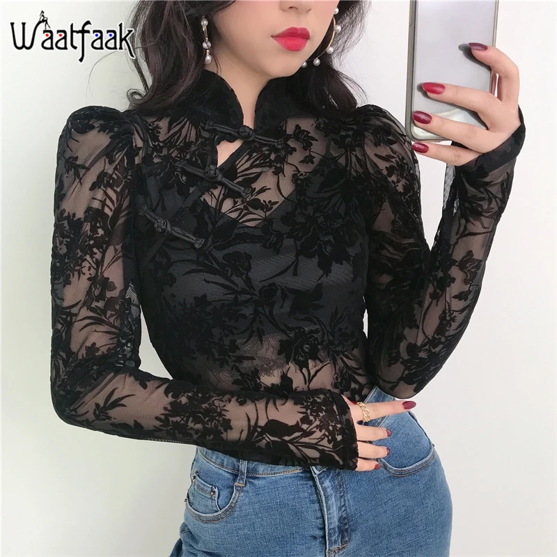 Waatfaak, китайский стиль, на пуговицах, водолазка, черный, боди, для женщин, цветок, сексуальный, сетка, боди, прозрачный, длинный, с пышными рукавами, Новинка