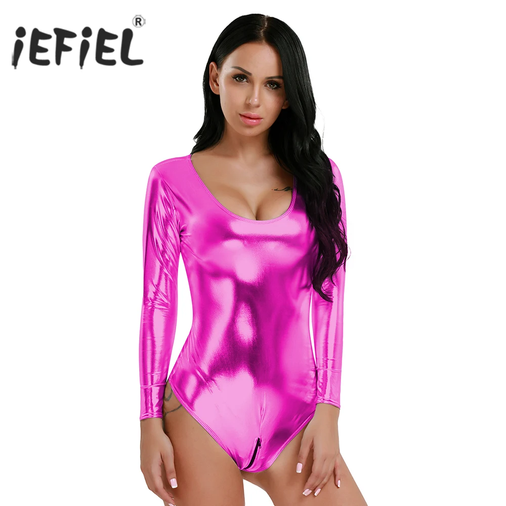 IEFiEL/пикантные женские Wetlook Bodycon лакированная кожа боди с молния мотня с высокой танцевальная одежда для ночного клуба вечеринок