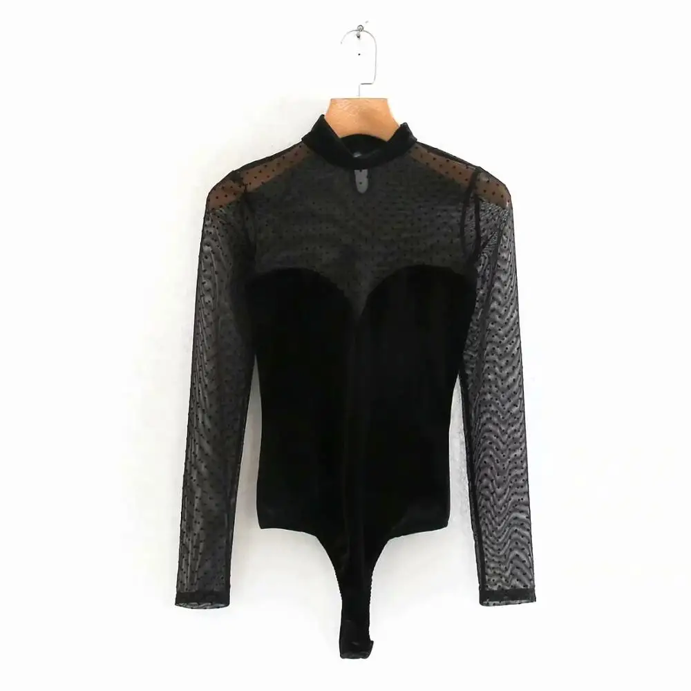 Женское сексуальное бархатное боди в мелкий горошек, в сеточку, в стиле пэчворк, Женская шикарная перспективная блуза, сиамские блузы, Ретро...