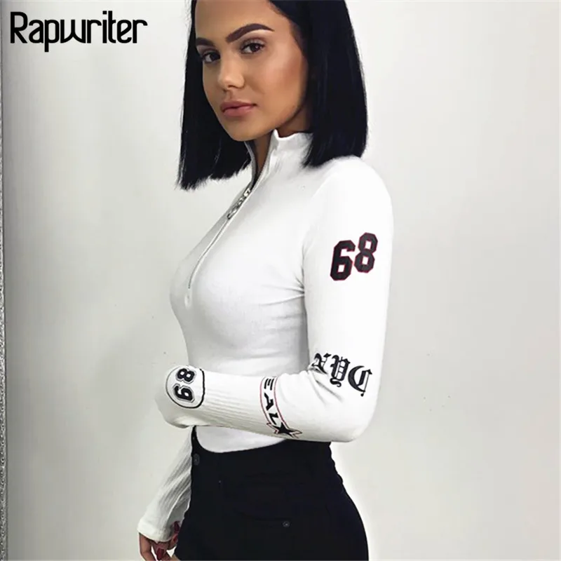 Сексуальное Женское боди Rapwriter с длинным рукавом и кольцом на молнии, Осень-зима 2018, облегающее обтягивающее белое боди с принтом