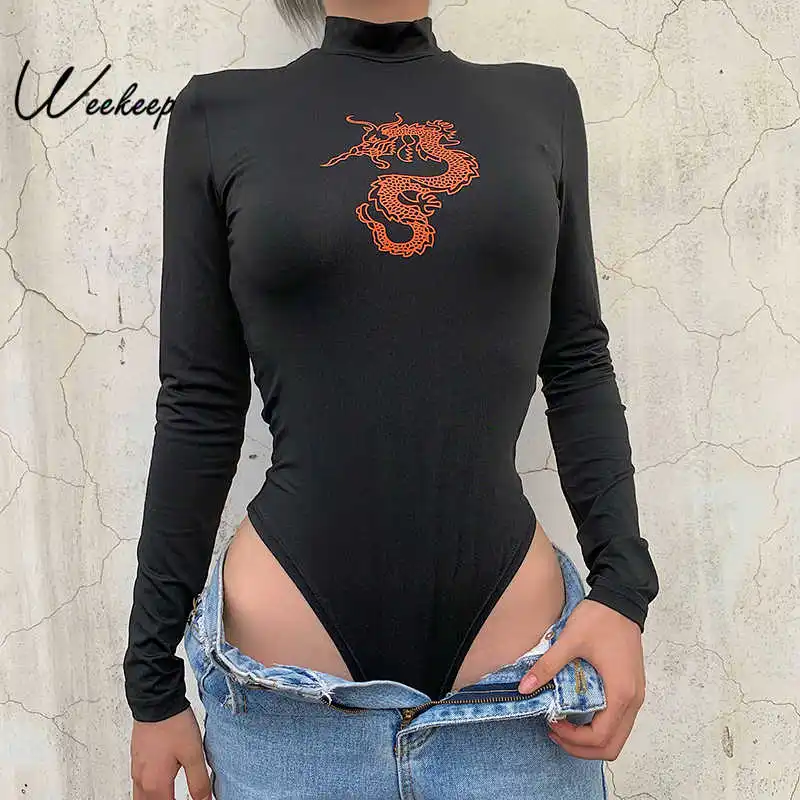 Weekeep/боди с длинным рукавом и принтом дракона, женский сексуальный черный облегающий комбинезон, боди, весна-осень, с круглым вырезом, уличная одежда, боди
