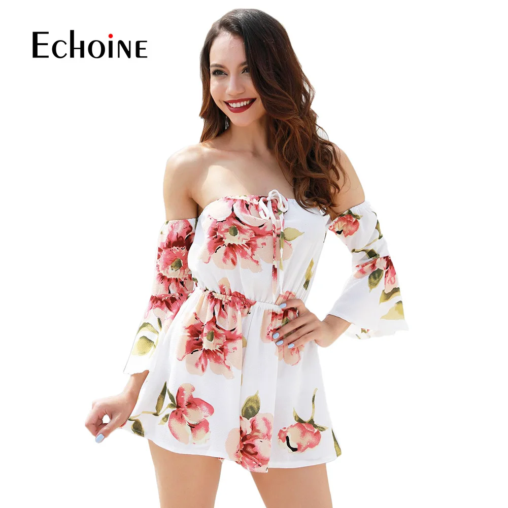 Сексуальный Модный цветочный принт женский комбинезон 2019 Летний Пляжный с открытыми плечами боди Костюм Повседневный Свободный комбинезо...