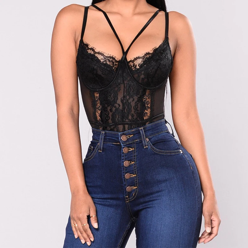 Sibybo сетки See Through Sexy кружево боди для женщин Спагетти ремень без рукавов Летний комбинезон спинки пляжные женские боди
