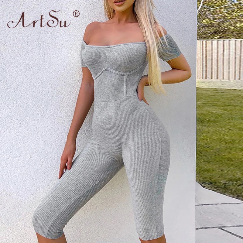 ArtSu ребристый вязаный повседневный комбинезон с открытыми плечами, Женский обтягивающий сексуальный комбинезон, Летний комбинезон 2020, новые спортивные костюмы с коротким рукавом
